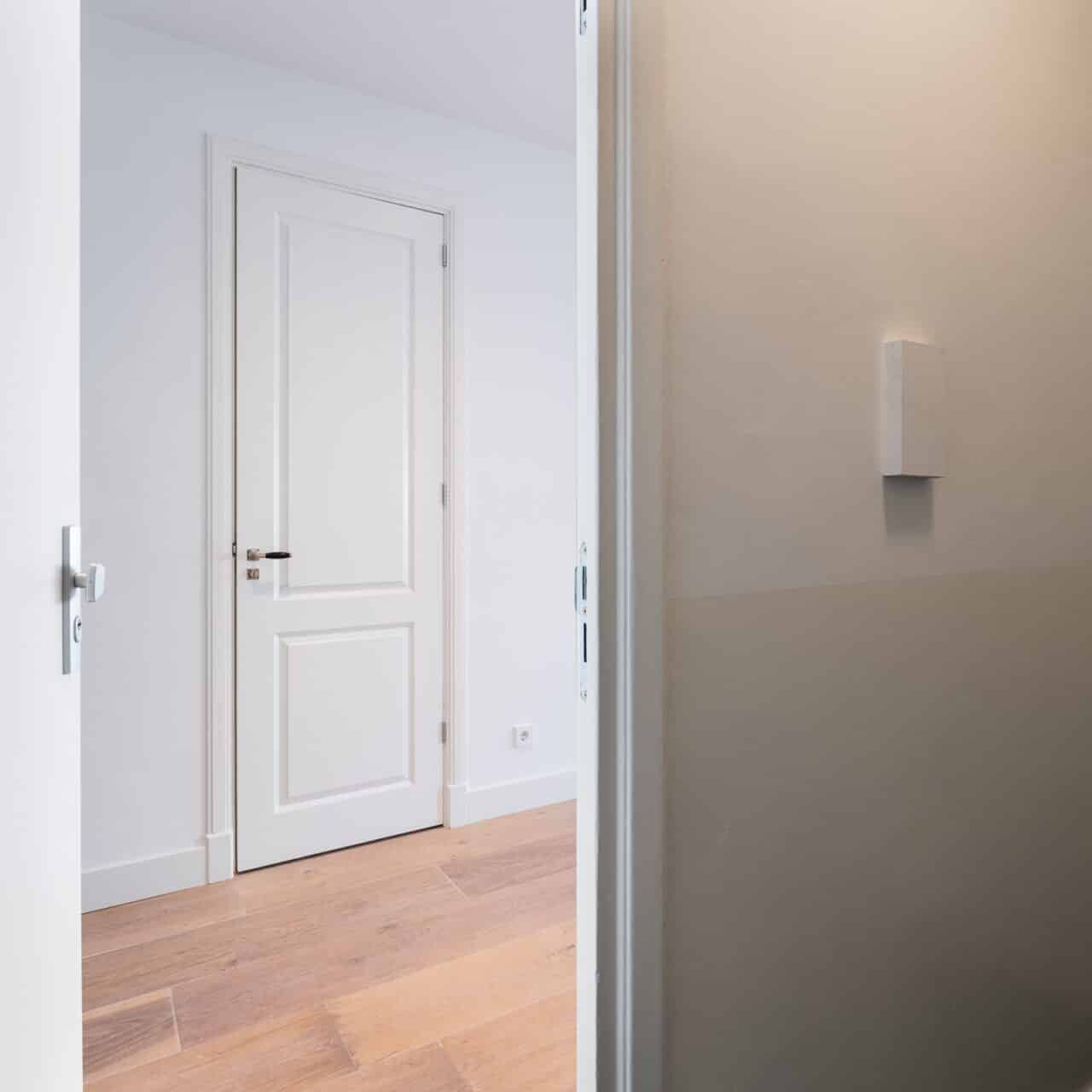 Gemeenschappelijk entree begane grond, trap naar de tweede verdieping, hal met apart toilet en toegang naar alle vertrekken. Lichte woonkamer met een open rechte keuken voorzien van SMEG apparatuur zoals een koel/vriescombinatie, vaatwasser, afzuigkap en groot fornuis. Aan de achterzijde bevinden zich de 2 slaapkamers met beide toegang naar het balkon. De moderne badkamer is voorzien van een wasbak, inloopdouche, toilet en wasmachine/droger. Het gehele appartement is voorzien van inbouwspots een houten white wash vloer en dubbelglas.