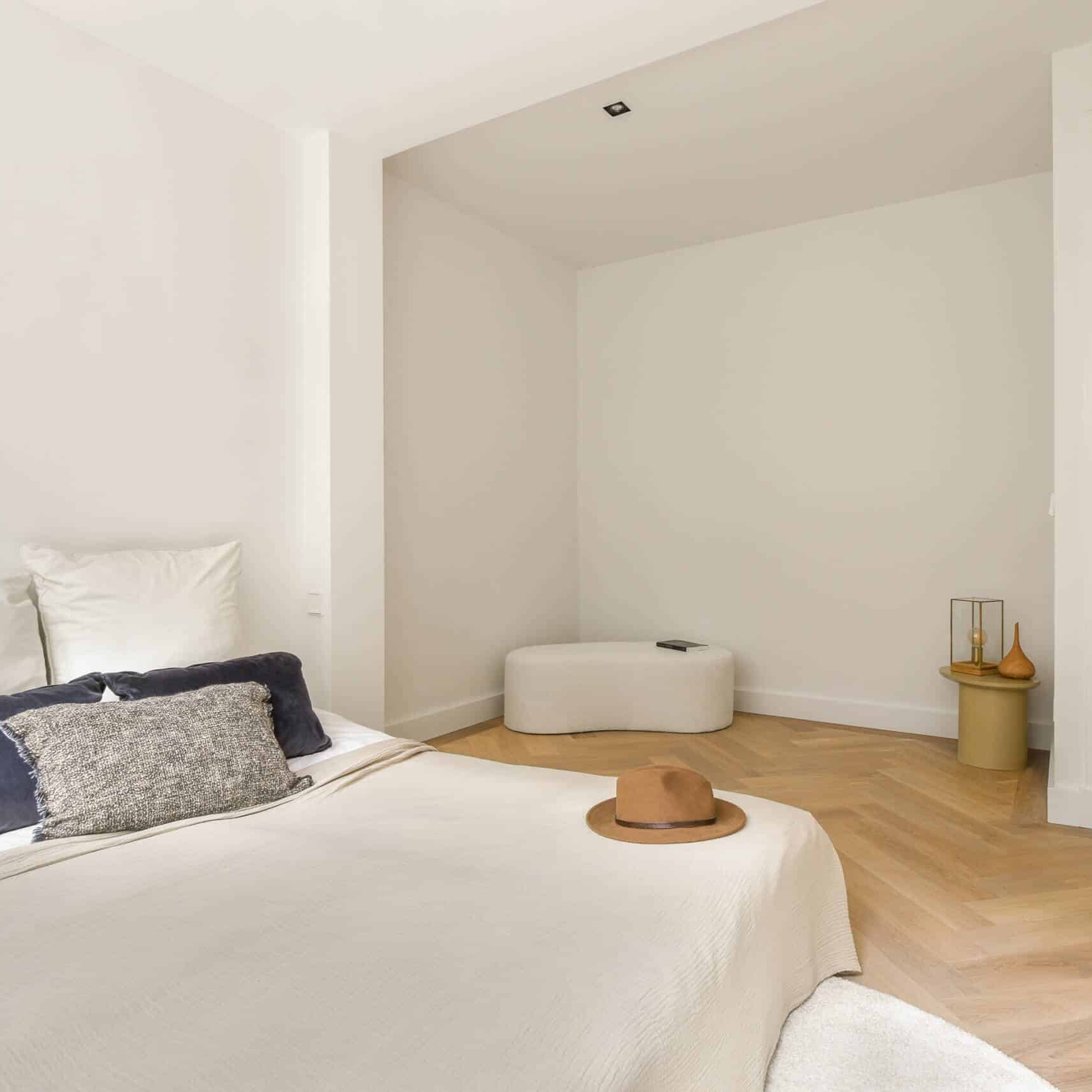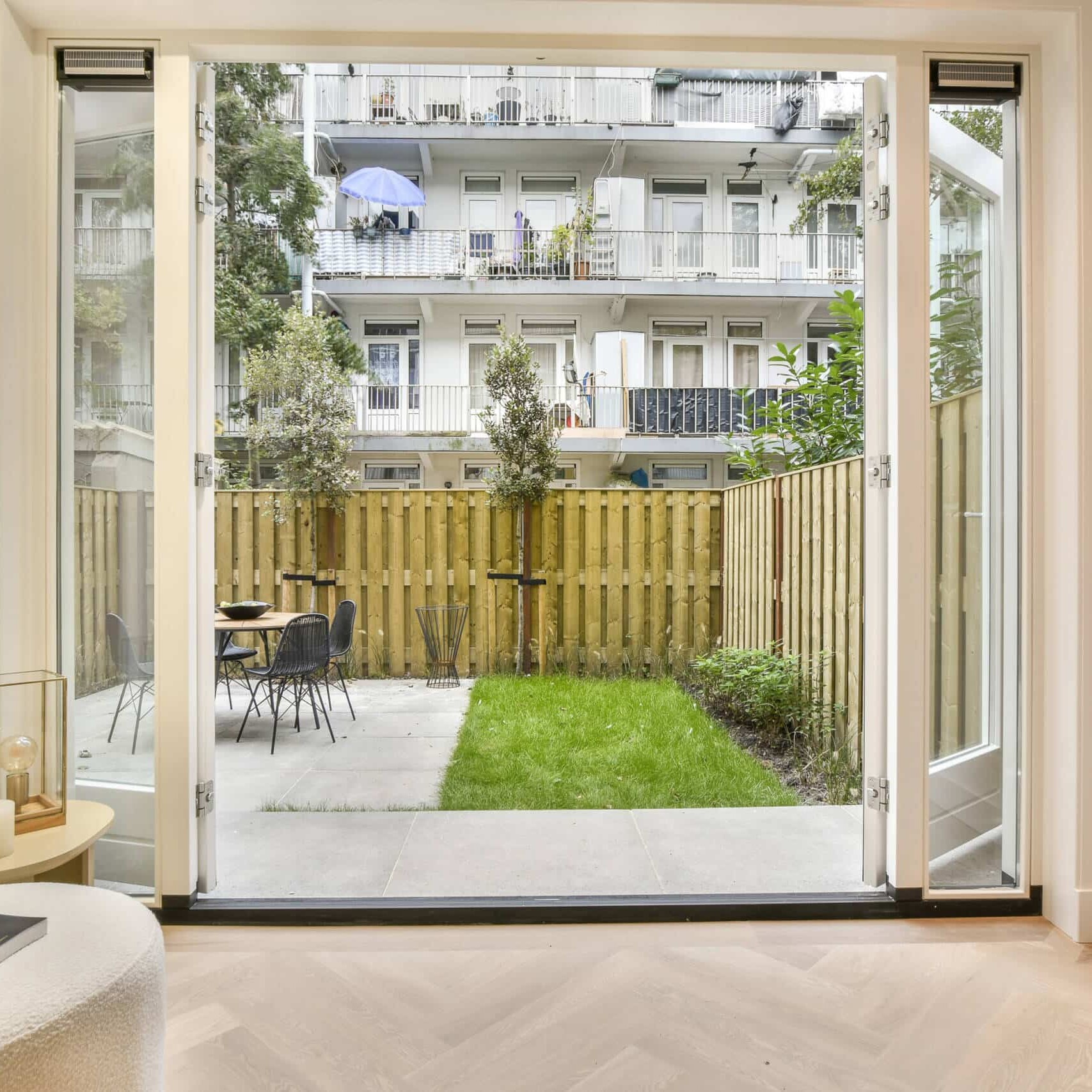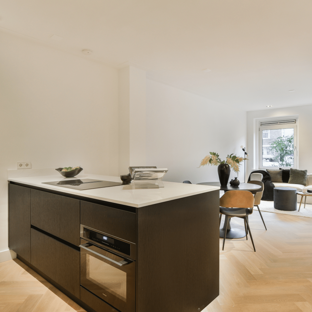 De woning heeft een eigen entree met een lichte hal die leidt naar een ruime woonkamer en een moderne open keuken, volledig uitgerust met hoogwaardige apparatuur. In het hart van de woning bevindt zich een eigentijdse badkamer, ontworpen met een inloopdouche en dubbele wastafel. Aan de achterkant van de woning bevinden zich twee royale slaapkamers, beide voorzien van openslaande deuren naar een ruime (34m²) en zonnige tuin op het oosten. De gehele woning is voorzien van vloerverwarming en een hoogwaardige eiken lamelparketvloer. In de plafonds zijn ingebouwde spots aangebracht en ook zijn alle ramen voorzien van dubbel glas.