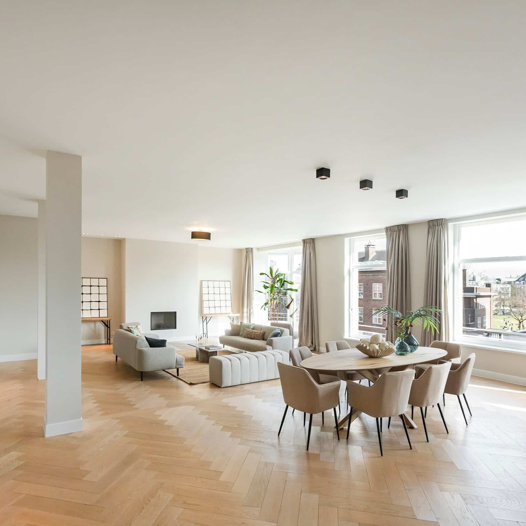 De woning kent een gelijkvloerse woonlaag van 239 m2, uniek voor Amsterdamse begrippen. De zeer ruime woonkamer wordt gecompleteerd door een sfeervolle haard en prachtig uitzicht op het groene Museumplein. Het appartement bevindt zich in volledige rust door zijn goede isolatie. Aan de achterzijde is een terras over de gehele breedte gesitueerd met ruimte voor een zithoek en een eettafel.