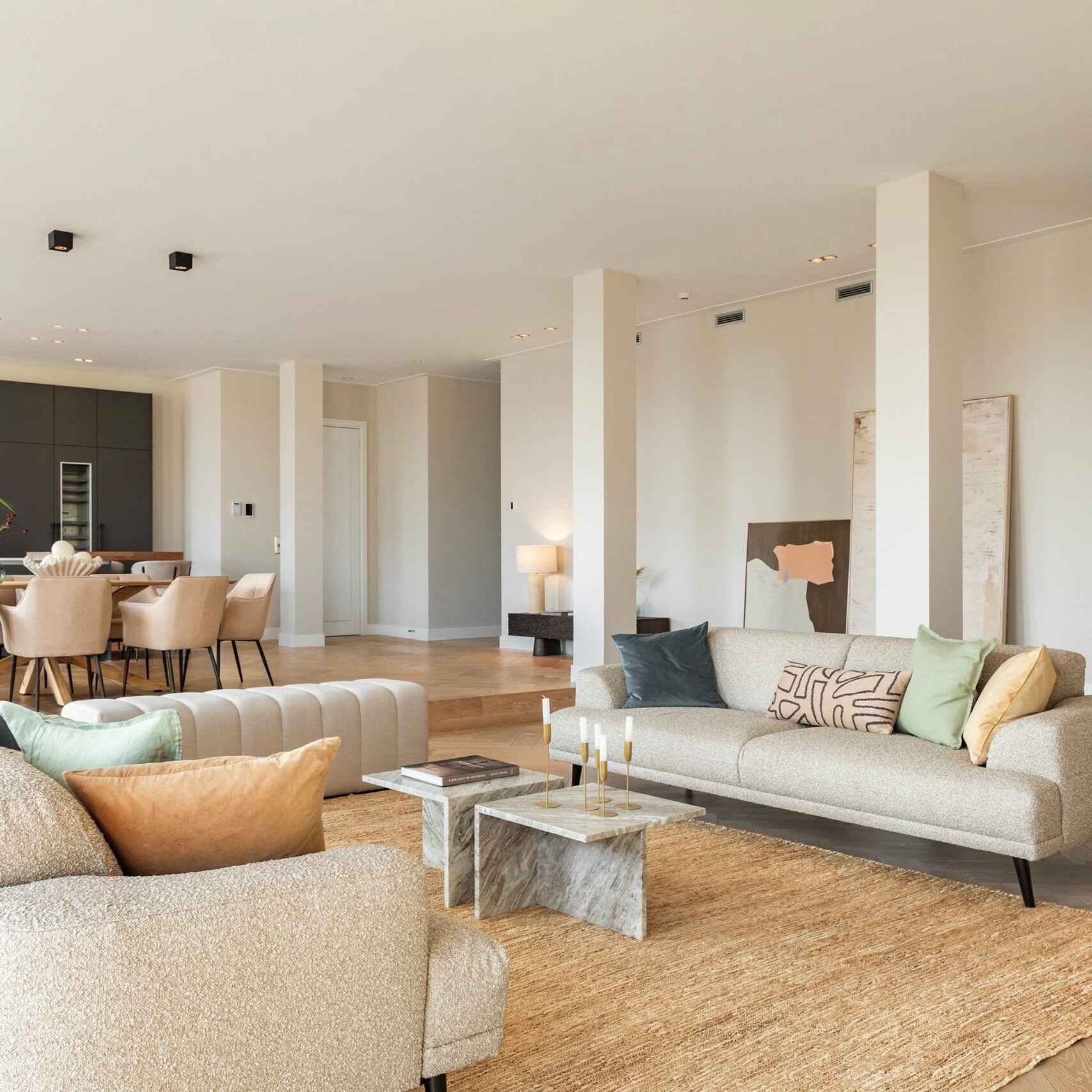 Via de lift, die direct in het appartement uitkomt, betreedt u een ruim en luxueus afgewerkt interieur. De royale woonkamer en design keuken aan de voorzijde vormen het hart van de woning, met een weids uitzicht over het Museumplein, het Rijksmuseum, het Van Gogh Museum en het Stedelijk Museum. Dit iconische panorama, gecombineerd met het stijlvolle interieur, maakt deze leefruimte tot een waar pronkstuk.
