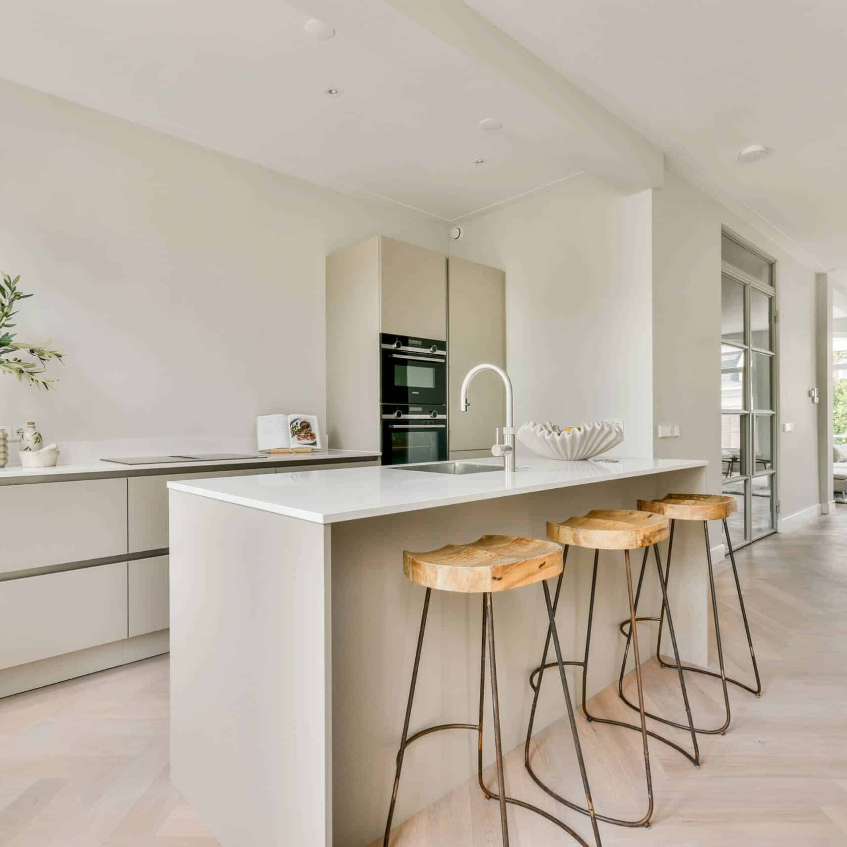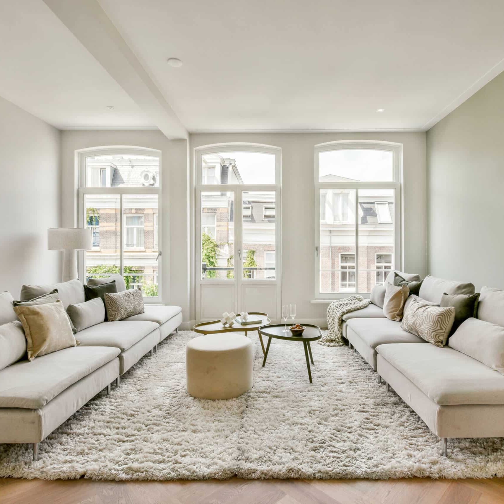 Via the open hall you enter the living floor through beautiful steel glass doors where the living room with open kitchen extends from front to back and covers the entire floor. Due to the large windows at both the front and back, the entire floor is very open and light. At the front is the living room with patio doors to the characteristic French balcony. At the rear is the spacious modern open kitchen with plenty of cupboard space. It has a composite worktop and is equipped with various built-in appliances from the Siemens brand, namely a dishwasher, fridge-freezer, 4-burner induction hob with internal extractor system, a combi oven, baking oven and a Quooker. From the kitchen you have access to the house-wide balcony at the rear, located on the southwest. From the hall you reach the separate toilet and the stairs to the fourth floor.