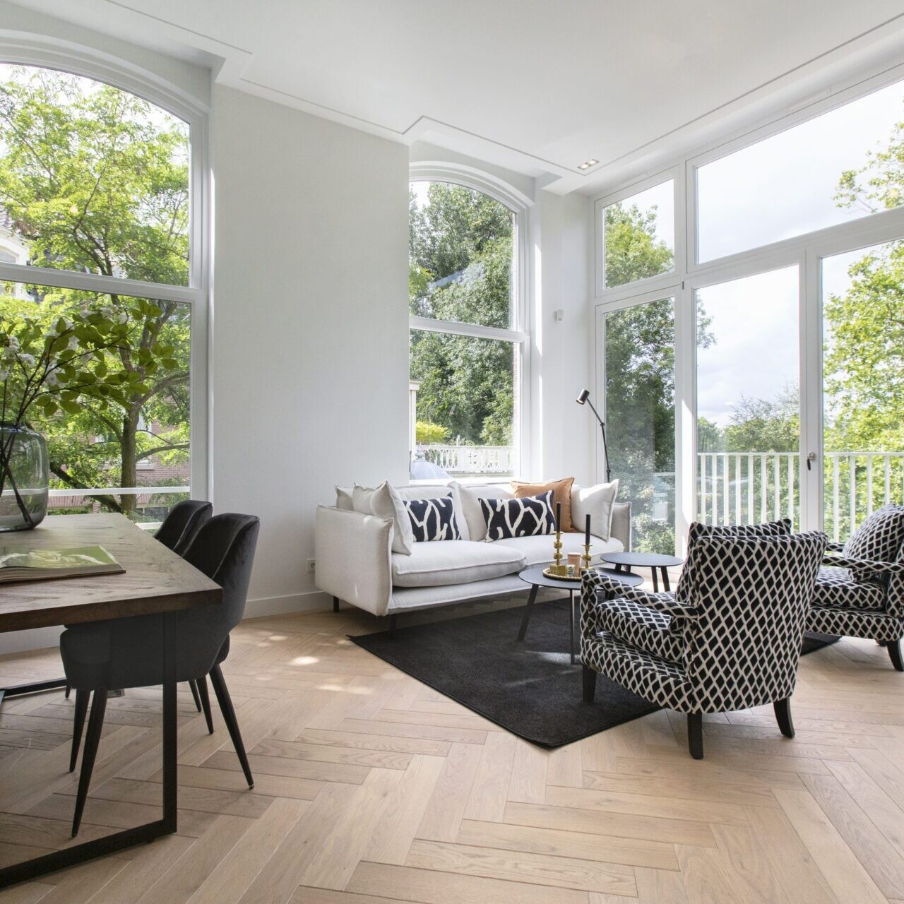 Middels de lift of de trap is de tweede verdieping te bereiken, waarbij u met de lift direct in het appartement uitkomt. De zeer lichte woonkamer is aan de parkzijde gelegen en heeft een spectaculair uitzicht over het Vondelpark. Door de hoge openslaande deuren en het Franse balkon is er een mooie verbinding met het groen en het park. De vele ramen en hoge plafonds zorgen voor een prachtige lichtinval in het appartement.