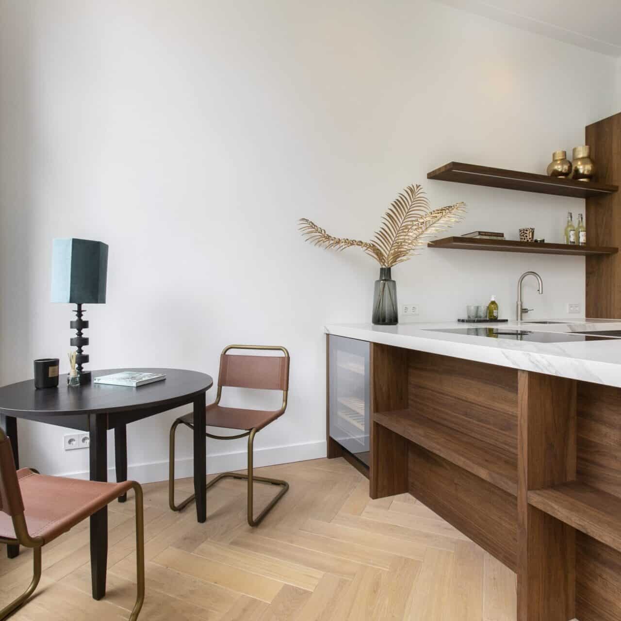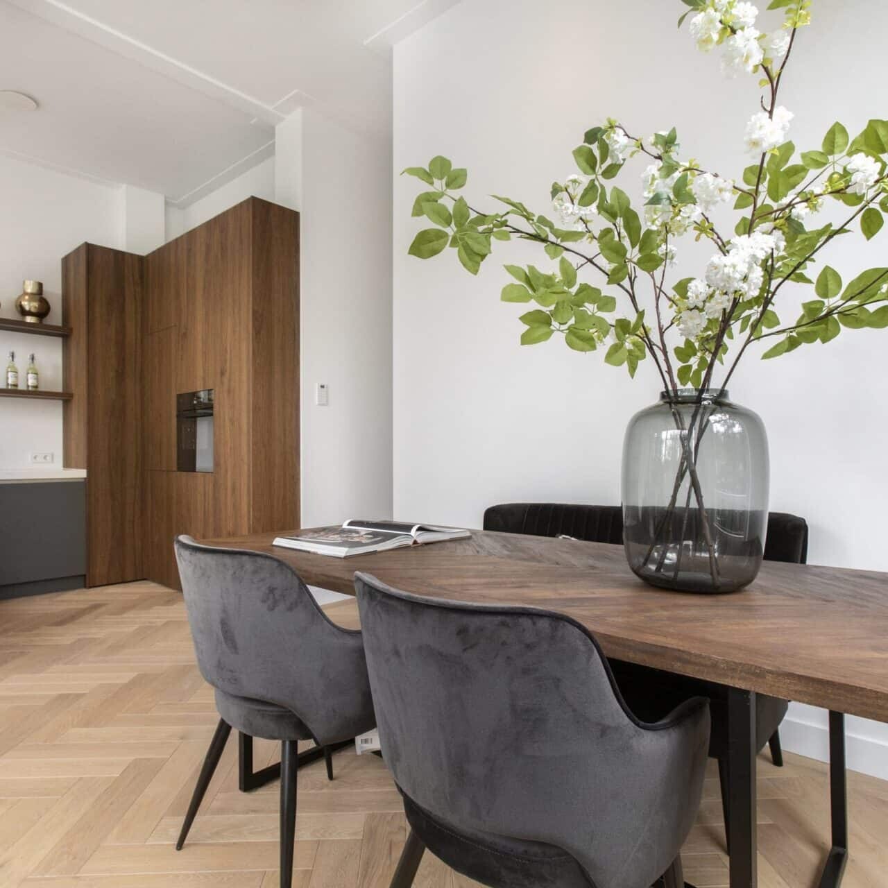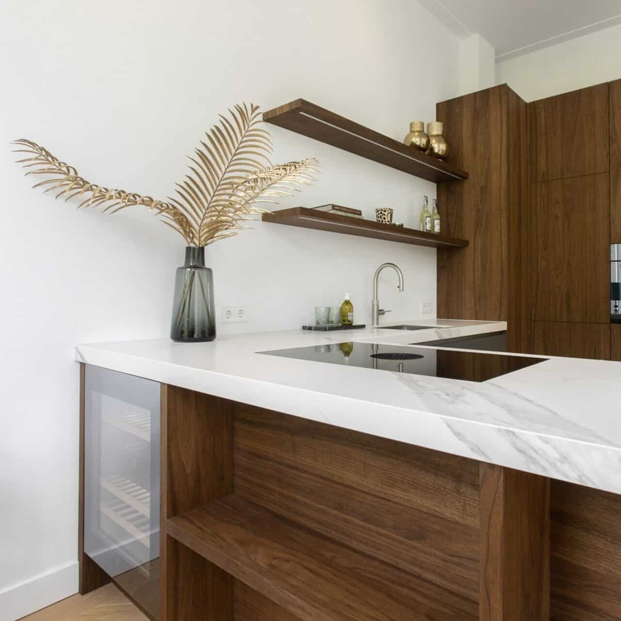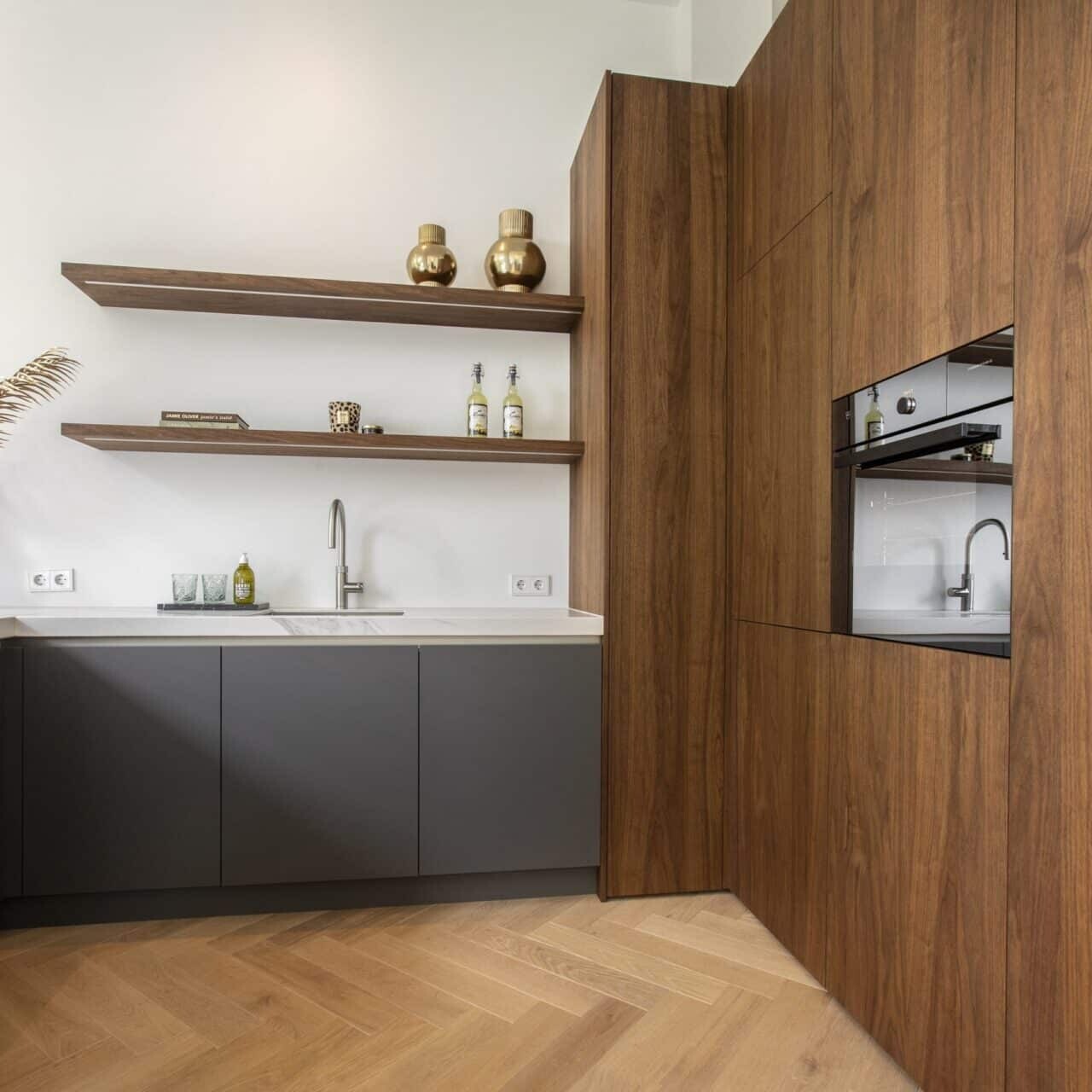 De exclusieve keuken bestaat uit een hoge kastenwand van notenhout, mat grijze fronten en een licht Dekton blad. De nodige inbouwapparatuur is aanwezig, te weten; een grote ijskast, vriezer, oven, Bora inductiekookplaat met geïntegreerde afzuiging, vaatwasser, wijnklimaatkast en een Quooker.