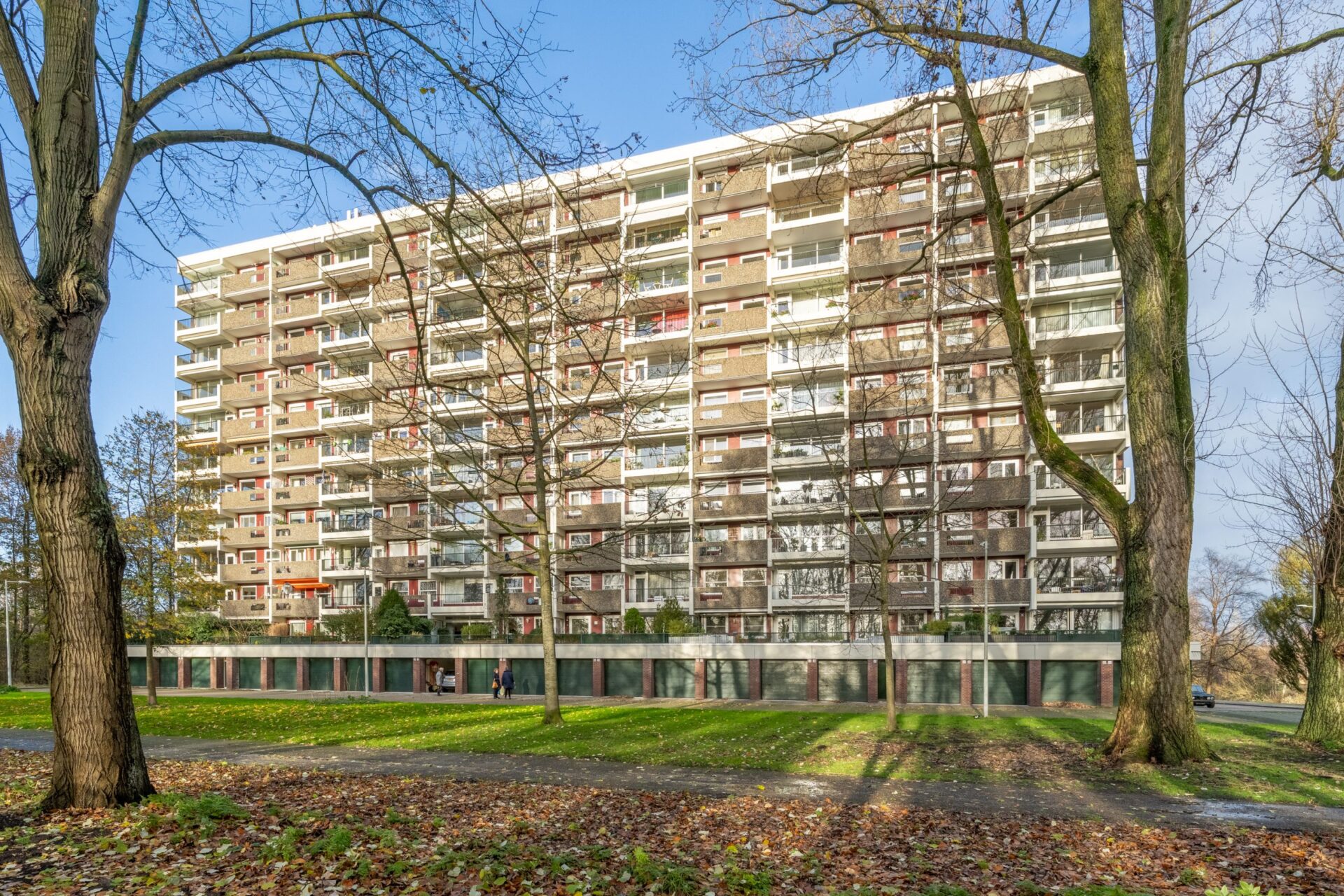 Aan de achterzijde van het huis ligt de master bedroom met openslaande deuren naar het westelijk gesitueerde balkon. Vanaf het balkon kijk je uit over de groene tuinen van de benedenwoningen.