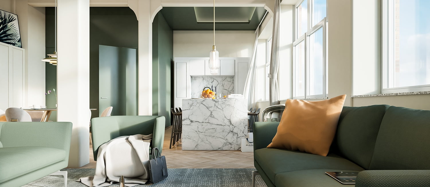 De stoere en verfijnde loftwoningen van circa 155 tot 264 m² hebben tot circa 3.85 meter hoge plafonds en baden in daglicht door enorme, originele raampartijen aan beide zijden. De appartementen hebben een loggia of dakterras op het zuiden. De prachtige authentieke elementen geven de woningen een unieke sfeer die zich laat combineren met iedere interieurstijl.