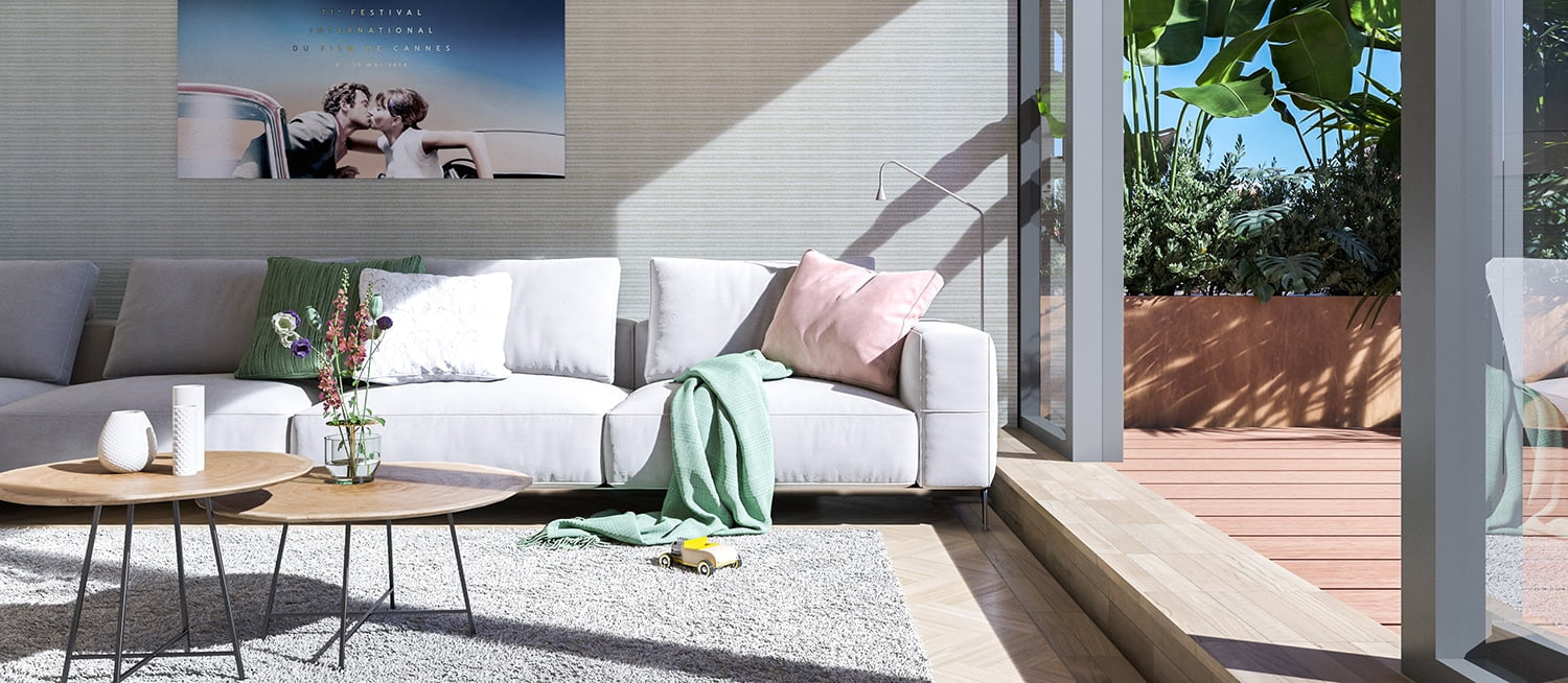 Het appartement heeft een zuidgeoriënteerde loggia. Een serre-achtige ruimte die schuilgaat achter een van de grote raampartijen in de zuidgevel. Een fijne beschutte plek zonder inkijk van boven, met genoeg ruimte voor een grote eettafel of een loungehoek.