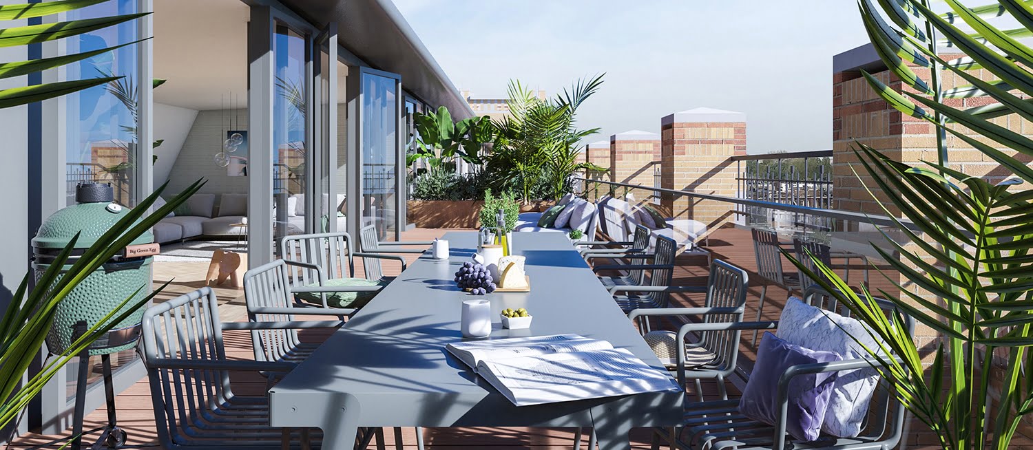 Het penthouses heeft op de vierde verdieping een dakterras op het zuiden, over de volle breedte van het appartement. Het terras is afgewerkt met bankirai vloerdelen. Vanaf hier kijk je uit over de stad en zie je in de verte de skyline van Amsterdam.